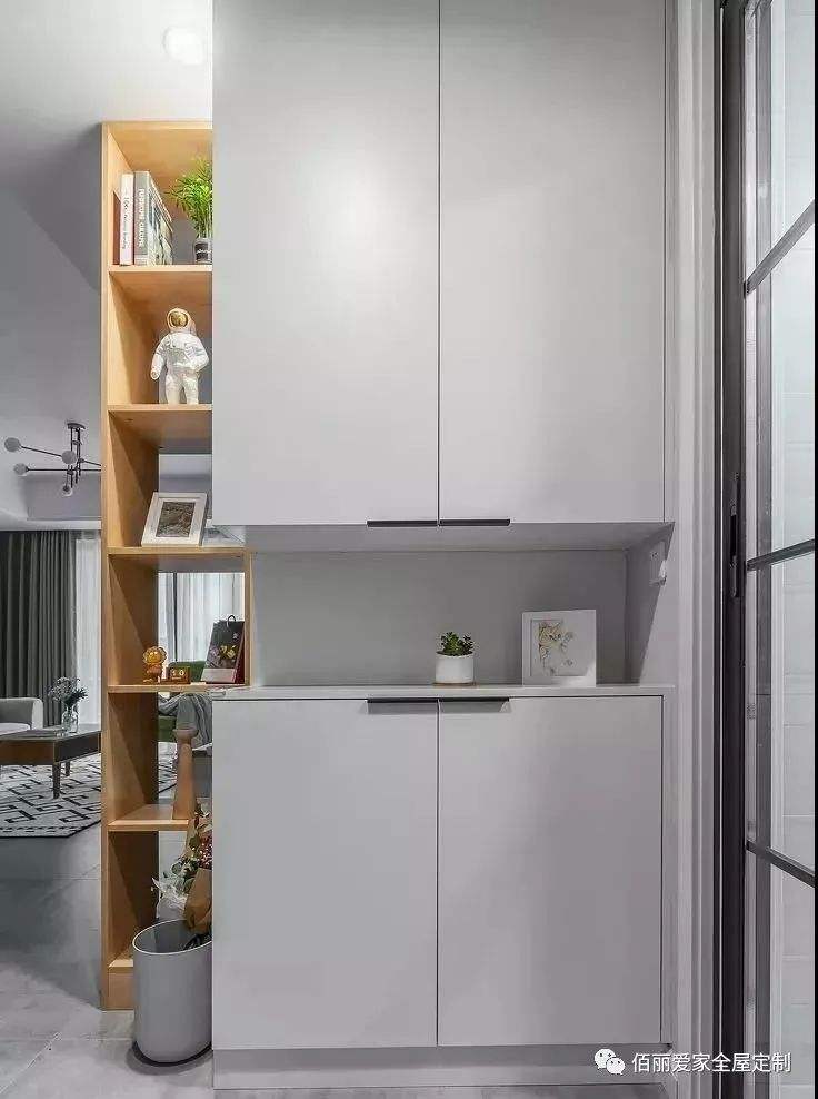 Bạn nghĩ sao về thiết kế tủ giày kết hợp kệ trang trí cùng vách ngăn phòng khách siêu tiện lợi.