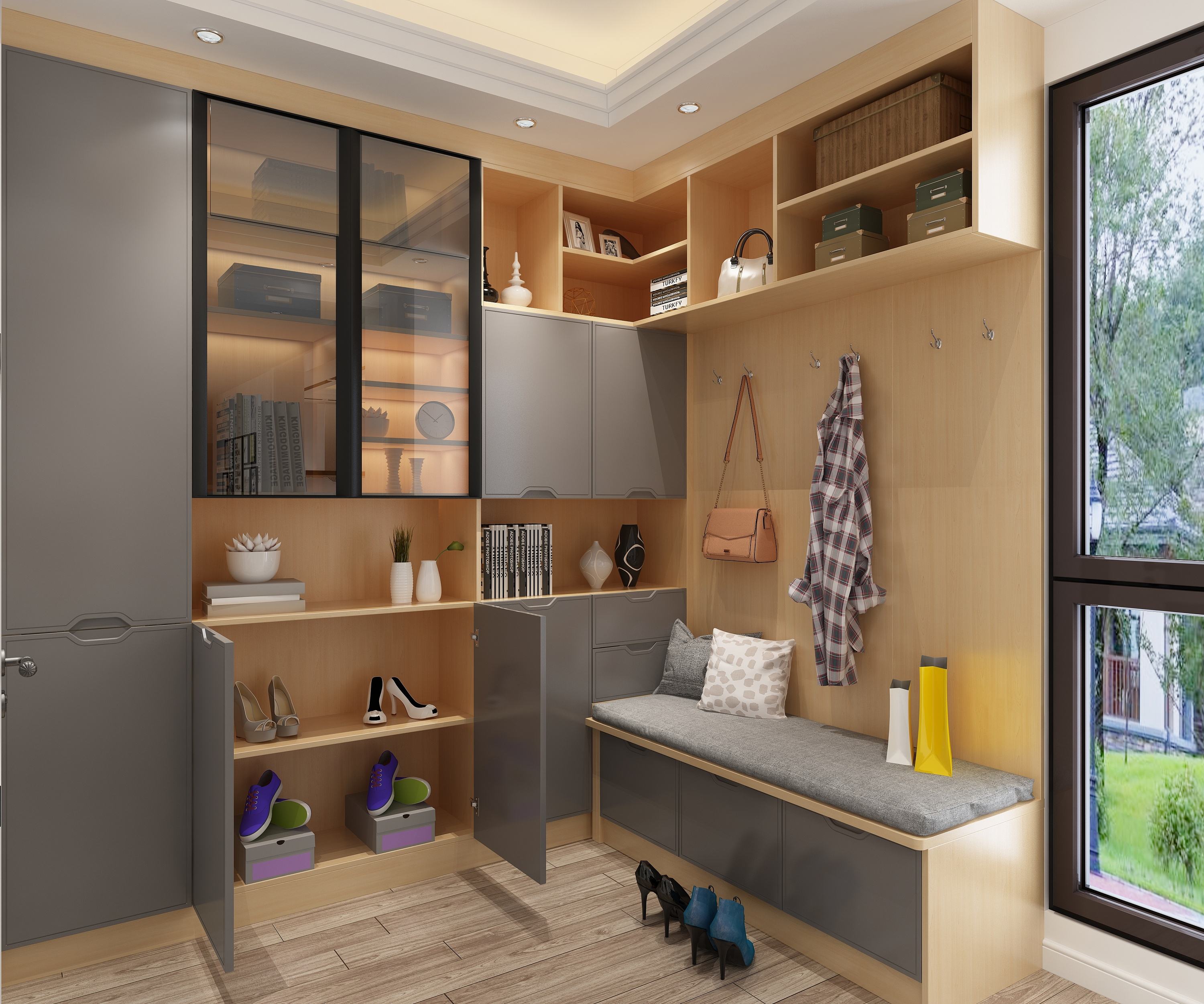 -Bạn hãy thiết kế không gian của tủ giày sát trần có khoảng trống để trang trí vào 1 vài cây xanh sẽ trông mát mắt hơn nhiều nhé.